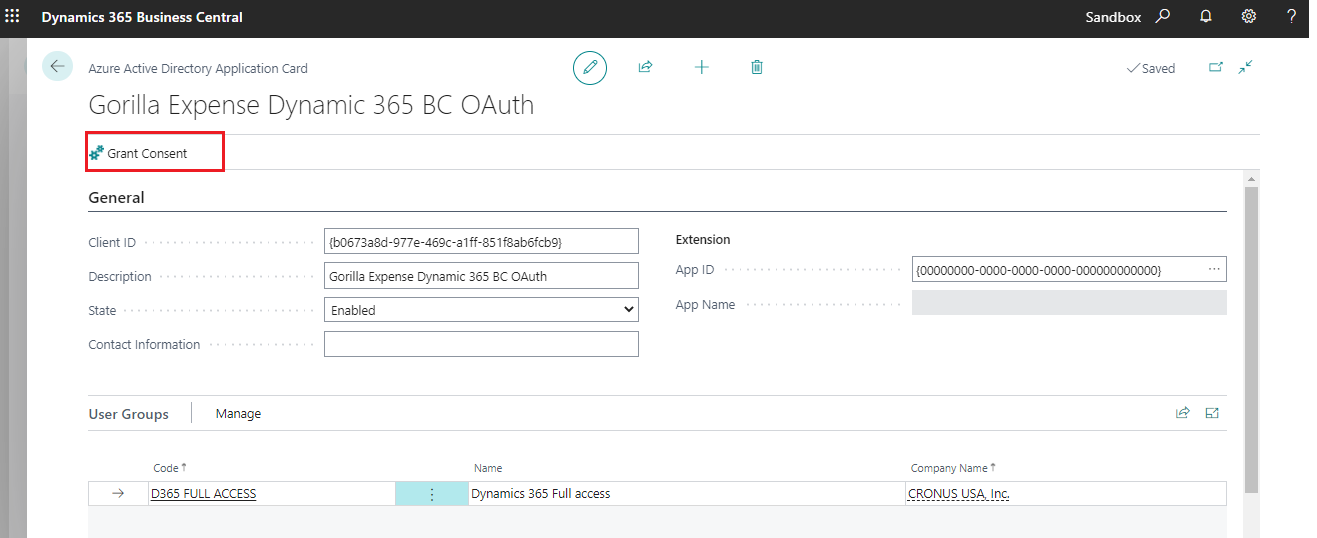 2) Copy Client Id from the App “Overview” and paste it in the Client ID field. Under User Group section provide the full access (D365 Full Access) - please refer to the sample screenshot below.