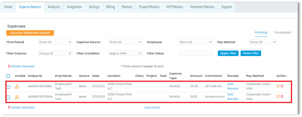 6. After successfully importing Bank Transactions user should login with the Admin credentials to gorilla expense manager and Go to Expense Reports tab -> Expenses and check if the imported Bank Transactions are displayed