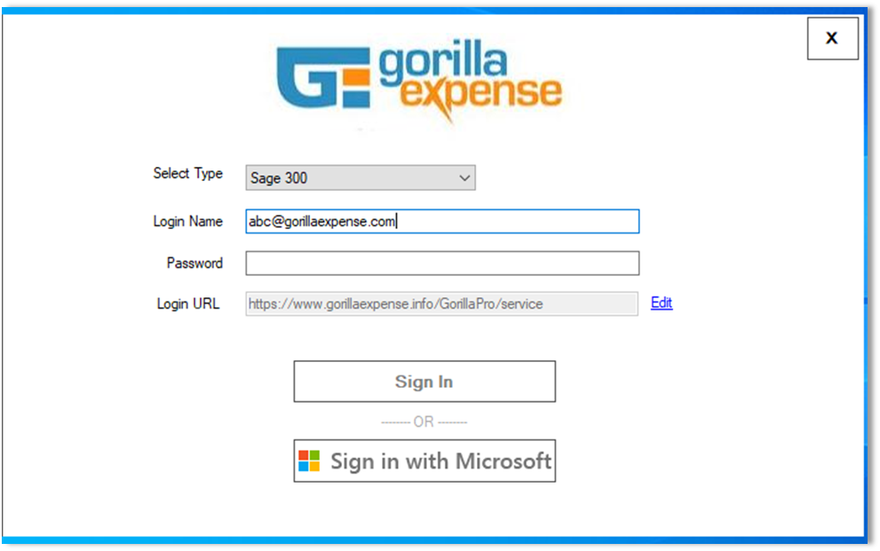 3) Login user name and password will be same as the one used to log into gorilla expense. Select any account system type (For example Sage)