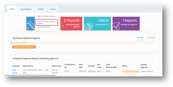 - To begin, the manager logs into the application and navigates to the Analytics section, followed by Query Employee Expense Reports.