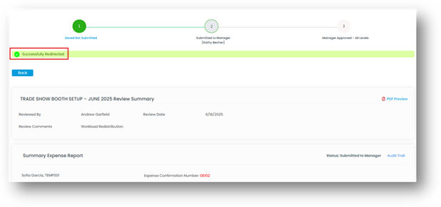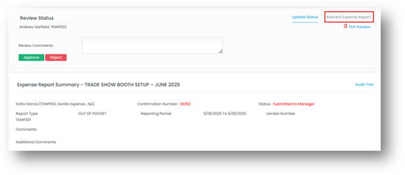- Once the desired expense report is located, the manager clicks on the Expense Report Name to open the report details. On this screen, the manager will find a Redirect Expense Report link positioned in the top-right corner of the Review Status section. Clicking this link opens a pop-up with two fields: Redirect To and Review Comments.
